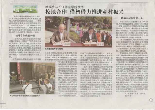 2018年9月29日,由传媒学院师生策划并实施的重庆市首届“增福土鸡文化节”在增福乡盛大举行,开幕式上,增福乡政府与长江师范学院传媒学院现场签订了“共建传媒专业实践基地”合作协议,携手传媒学院师生共同推动增福乡对外宣传工作,借智引力推进乡村振兴。