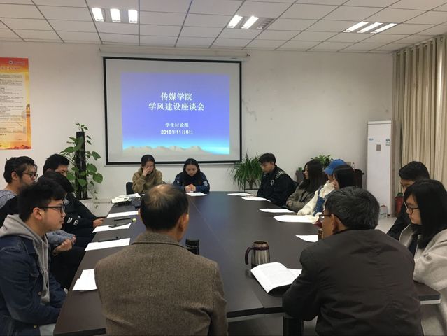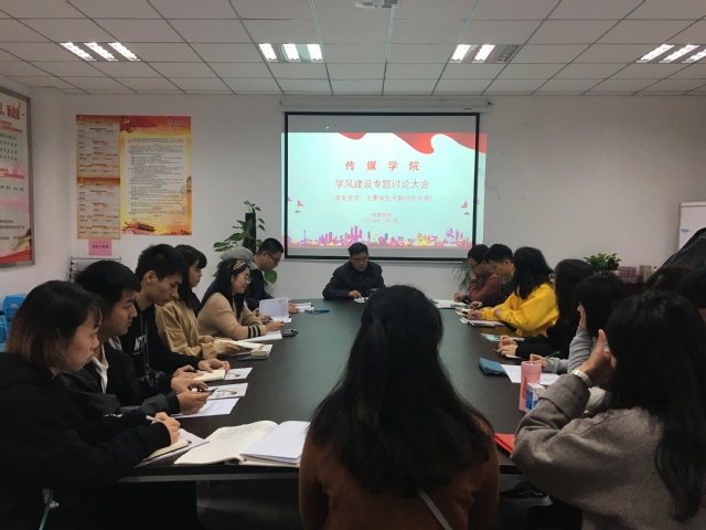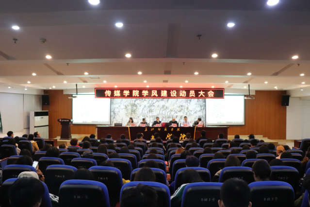20181111日,传媒学院学风建设动员大会在鉴湖学术厅召开,学院院长韦济木、党总支书记肖云久、党政办主任喻洁、学工办主任黄智、广电系主任袁峰、播音系主任许芫颜、网新系主任陈艳花、辅导员李泽榉、谭喻出席会议,201620172018级全体学生到场参加,大会由肖云久书记主持。