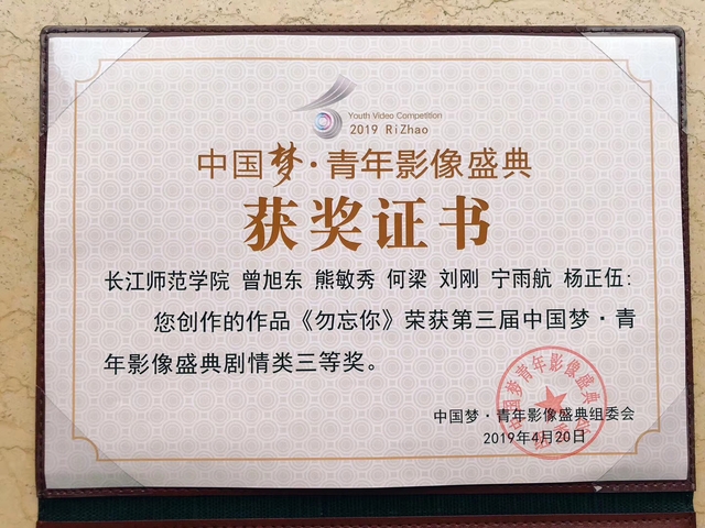 4月19-22日,第三届中国梦·青年影像盛典颁奖典礼在日照拉开帷幕。4700多部由国内外青年创作的影像作品齐聚一堂,共同记录、见证新中国成立70年来的伟大历史进程和时代变化,传承百年五四精神。本届影像盛典由中国文化信息协会国际影视文化交流专业委员会、中国社会科学院新闻与传播研究所世界传媒研究中心、中国高等院校影视学会、中共日照市委、日照市人民政府联合主办。由我校传媒学院陈丹、贾森老师指导,曾旭东、何梁、刘刚、杨正伍、熊敏秀、宁雨航六名学生拍摄的影片《勿忘你》,获得剧情类影片三等奖。