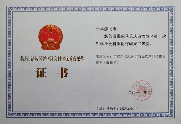 5月28日,在涪陵区社科联举行的2019年全区社科工作暨第十次社科成果颁奖会议上,我院于凤静教授的学术专著《当代东北地区少数民族新闻传播史研究》荣获社科研究优秀成果二等奖。