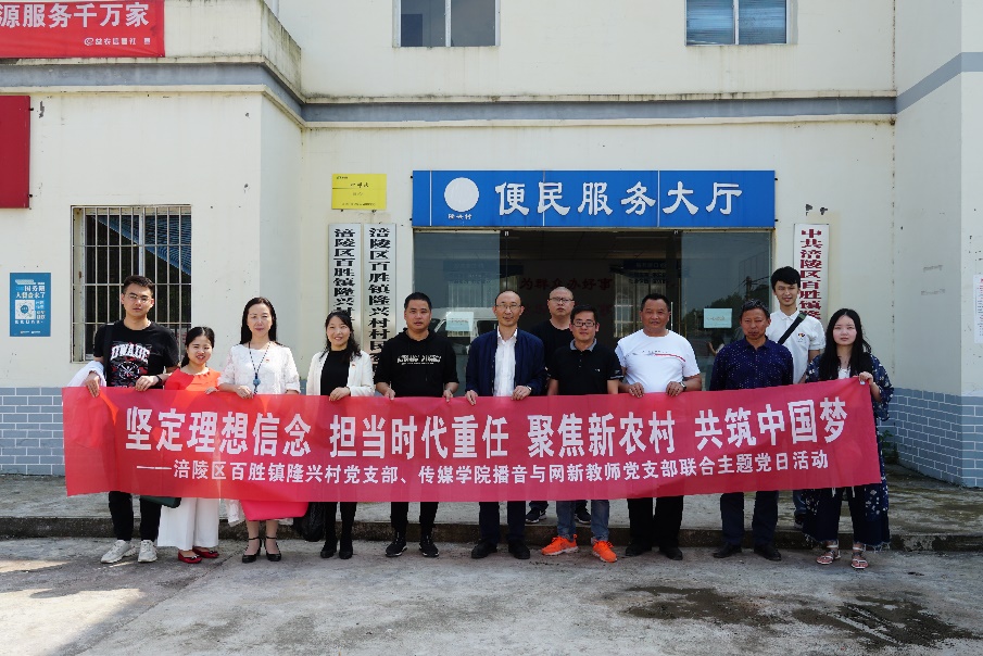 为贯彻落实《重庆市人民政府办公厅关于印发重庆市高等教育发展行动计划(2018—2022年)的通知》文件中“引导在渝高校与区县结对,支持高校扶贫协作,助力脱贫攻坚和乡村振兴”指示精神,积极响应今年习近平总书记视察重庆重要讲话精神,把总书记对重庆的亲切关怀转化为信念信心和实干实绩,5月31日下午,传媒学院播音与网新教师党支部前往涪陵区百胜镇隆兴村,和涪陵区百胜镇隆兴村党支部联合开展了“坚定理想信念·担当时代重任”主题党日活动。