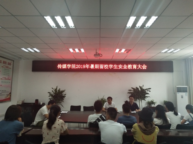 7月11日上午,传媒学院召开“2019年暑假留校学生安全教育大会”,会议由学工办主任黄智主持,党总支书记肖云久,辅导员李泽榉、谭喻、全体留校学生参加。