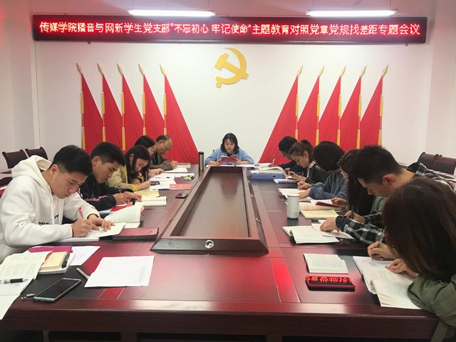 (通讯员:成虹霞)10月16日晚上19时,传媒学院播音与网新学生党支部于格致楼2318会议室召开“不忘初心、牢记使命”主题教育对照党章党规找差距专题会议。传媒学院播音与网新学生党支部书记王雯、纪检委员谭喻及支部全体在校学生党员参加了此次会议,传媒学院党总支副书记韦济木列席此次会议。会议由传媒学院播音与网新学生党支部书记王雯主持。