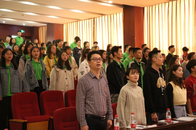 培训伊始,2018级学生许诗乔介绍了此次培训的相关流程并主持了此次培训大会,而后全体同学起立摘帽齐唱团歌,团委书记黄智带领全体同学宣誓。
