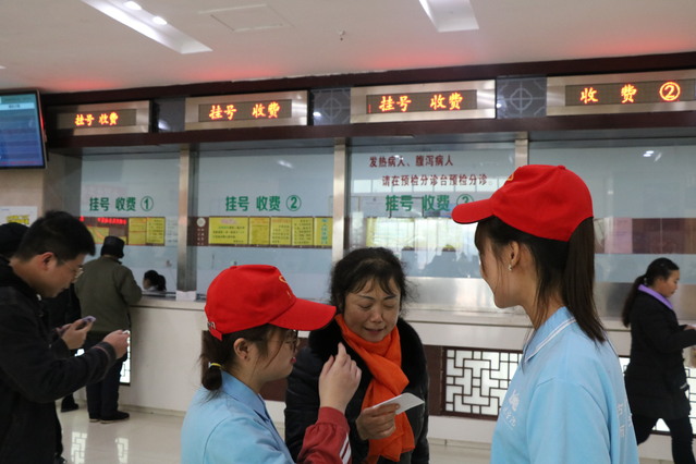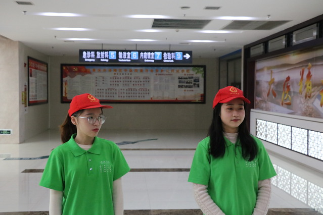 “小妹妹,请问妇产科在几楼啊?”“妇产科在二楼,先往左边走,然后……来,我带您去。”一位患者来询问医院科室情况时,志愿者们不仅耐心地为患者指出该科室的具体位置,还热心地带领患者前往该科室,患者被志愿者们的热情所包围,对志愿者们连连道谢。