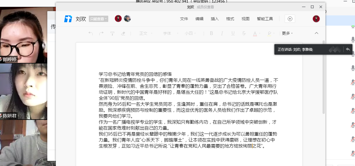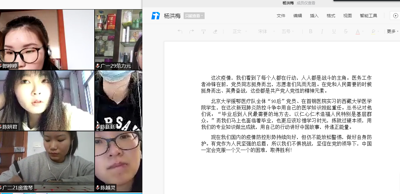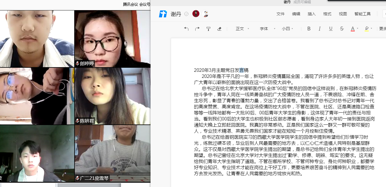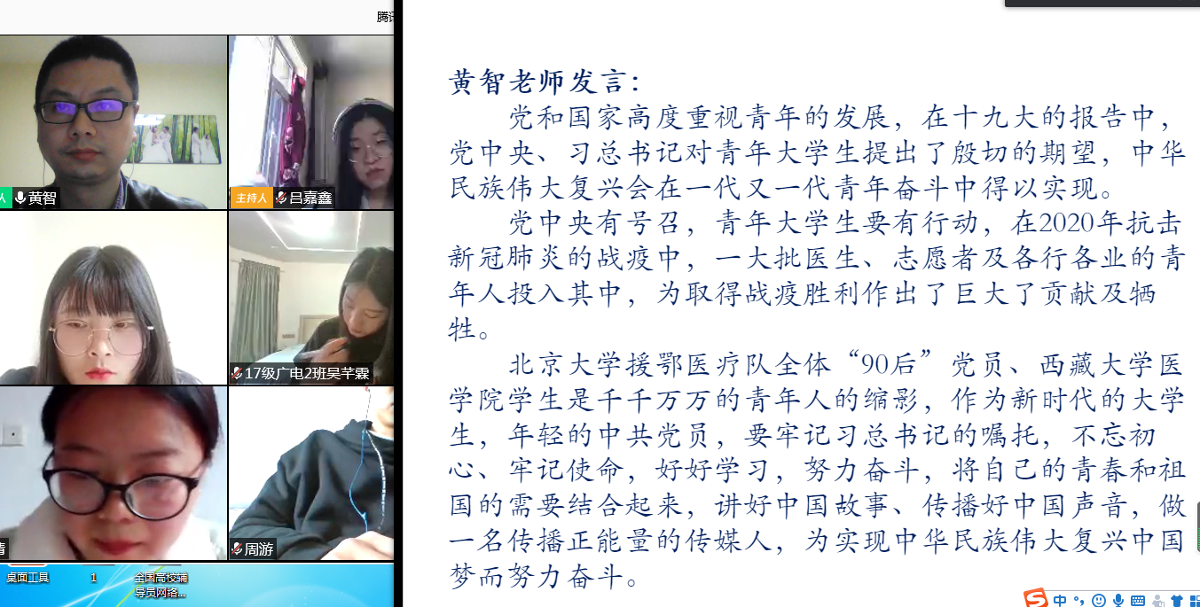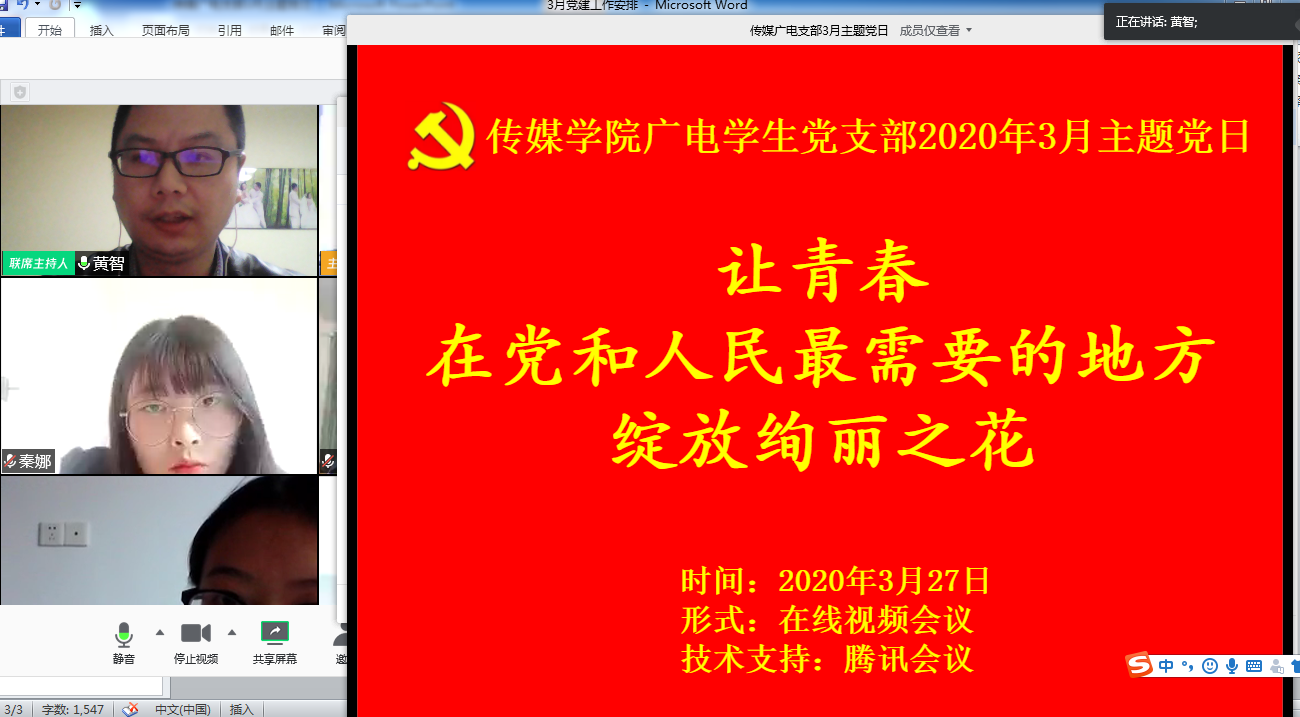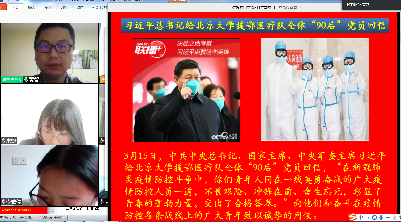 327日,传媒学院广电学生党支部全体党员克服新冠疫情影响,借助腾讯会议APP在线上开展了主题为“让青春在党和人民最需要的地方绽放绚丽之花”的主题党日。
