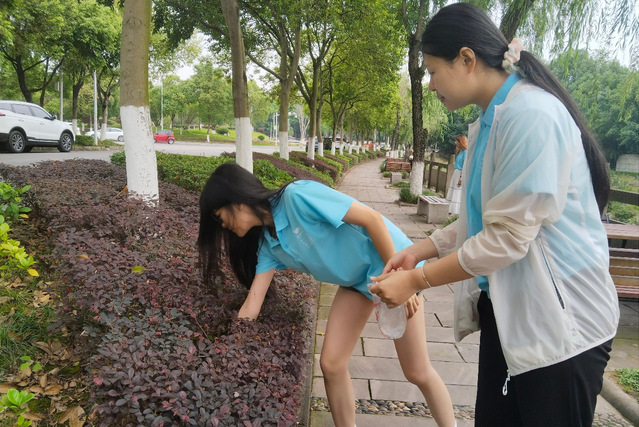 传媒学院公益部及印象鉴湖“河小清”志愿服务团身着院服,手持清洁工具,清理烟头、纸屑、塑料瓶等垃圾,并宣传环保知识,倡导传媒学子爱护水资源、保护生态环境。