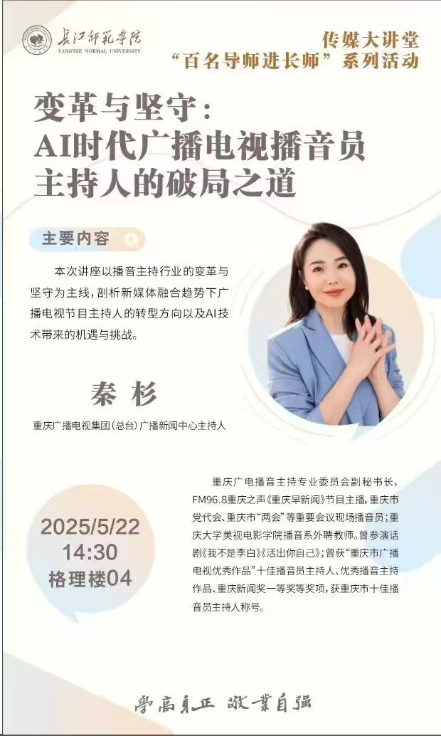 为帮助学生拓宽专业视野,认知行业变革,提升实践能力,5月22日下午2点30分,传媒学院于格理楼04阶梯教室开展主题为“变革与坚守:AI时代广播电视播音员主持人的破局之道”的讲座。重庆广播电视集团(总台)广播新闻中心主持人秦杉担任主讲人。