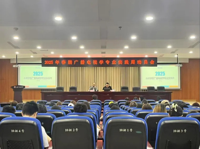 2025年5月12日,传媒学院2022级、2023级广播电视学与2024级新闻传播大类专业在学校鉴湖学术报告厅举行了2025年春期专业实践周动员大会,传媒学院副院长汪志平,系主任贾森,专业教师袁峰、杨颖、何润洲、阎敏等指导教师以及2022、2023、2024级各班学生出席了本次动员会。