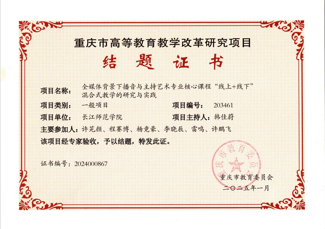 传媒学院韩佳蔚副教授主持的重庆市高等教育教学改革研究项目(一般项目)《全媒体背景下播音与主持艺术专业核心课程“线上+线下’项目名称:混合式教学的研究与实践》结项。