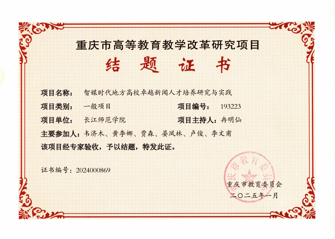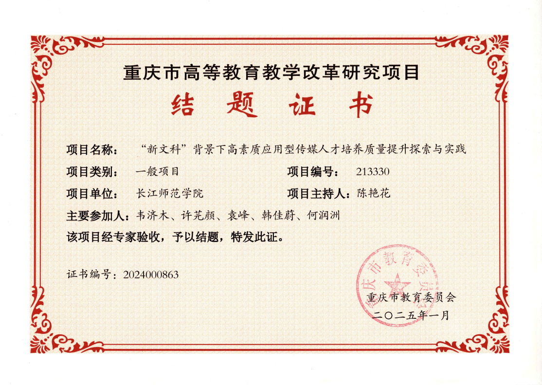 2025年重庆市教育委员会公布了2024年高等教育教学改革研究项目结项名单,长江师范学院传媒学院申报的三个项目全部获批结项,此次结项不仅体现了学院在教育教学改革领域的深厚积累,更彰显了其主动适应传媒行业变革、服务区域发展的前瞻性布局。结项的三个项目分别是冉明仙教授、陈艳花副教授、韩佳蔚副教授主持的重庆市教委教学改革项目。具体如下: