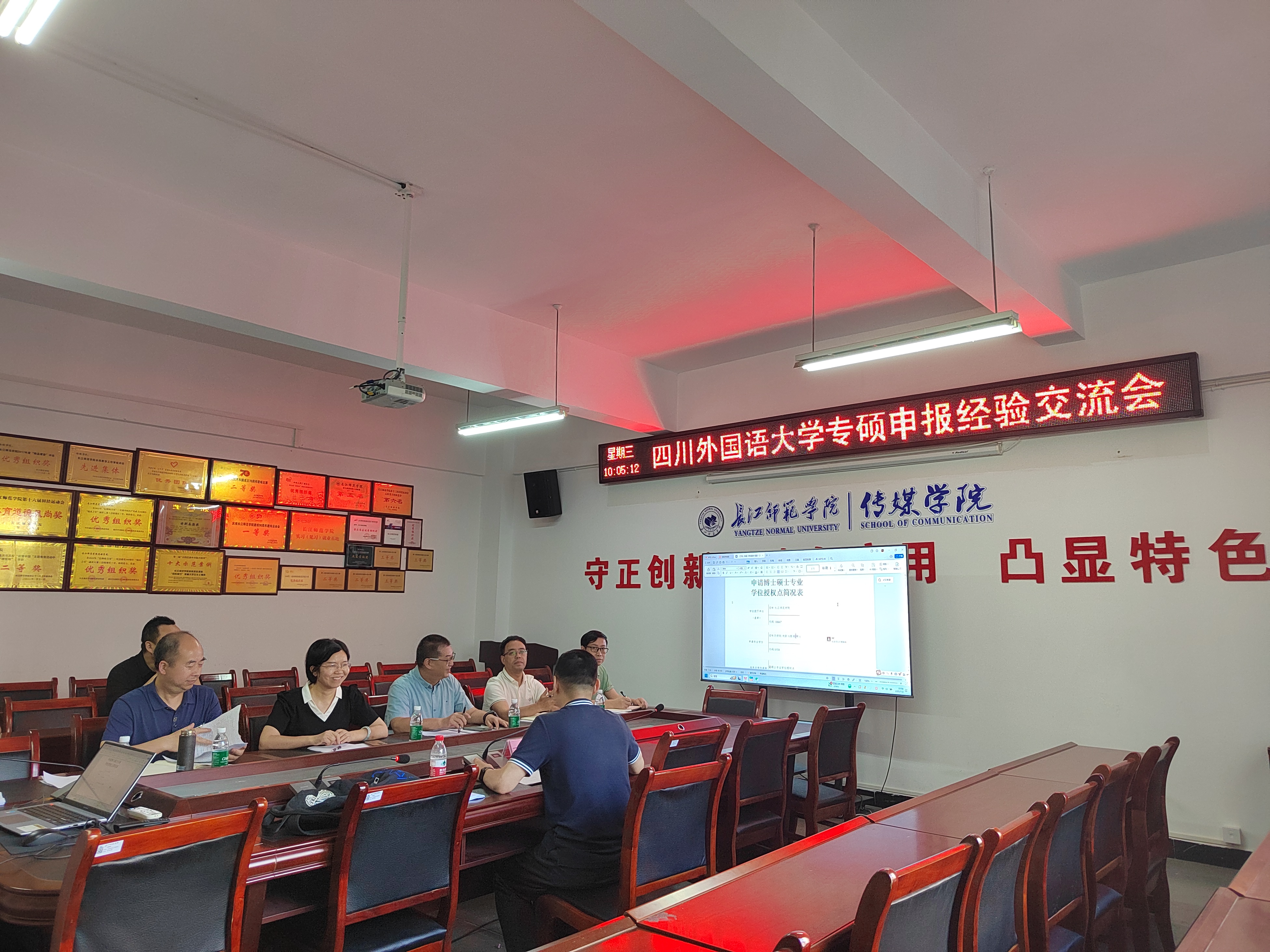 25年7月2日,传媒学院在格致楼2313会议室召开申硕经验交流会,会议邀请四川外国语大学戏剧与影视学科负责人、新闻传媒学院副院长丁钟指导申硕填报工作。传媒学院院长冉明仙、党委书记谢诗茂、副院长汪志平、实践教学中心主任张金龙、学工办主任王雯、各系主任及副系主任共同参与了此次会议。