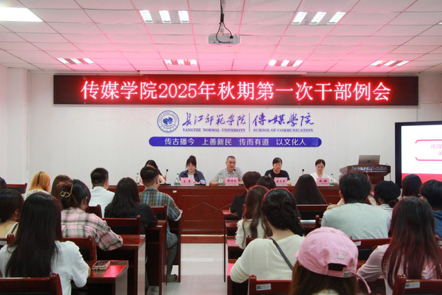 明确新学期工作方向,加强师生之间的沟通与协作97日下午3,传媒学院在格致楼2308召开了2025年秋期第一次干部例会。传媒学院党委书记谢诗茂学工办主任兼团委书记王雯、专职组织员余文莉、2023级辅导员姚瑜、2024级辅导员谭喻以及全体学生干部齐聚一堂,共同回顾过往工作,规划新学期的发展蓝图。
