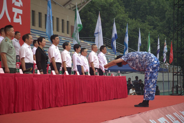 大会进入激动人心的授旗环节。校党委书记黄大勇同志将军训团团旗郑重授予军训团团长。鲜红的团旗在秋日阳光下熠熠生辉,团长接过旗帜,奋力挥展,全场爆发出雷鸣般的掌声。紧接着,黄大勇书记庄严宣布:“长江师范学院2025级新生军训,现在开始!” 铿锵有力的话语点燃了全场激情,掌声、欢呼声经久不息,2025级新生的军训征程正式拉开帷幕。