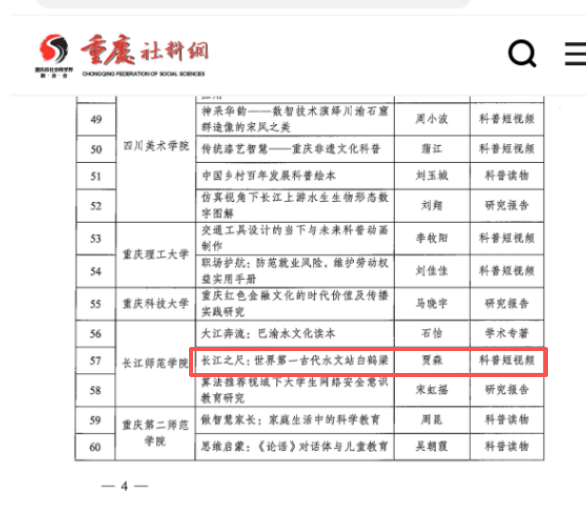 五、深化产学研协同,推动成果转化与社会服务。学院积极与地方政府、媒体机构和企业合作,将白鹤梁水文站文化传播、乡村数字治理等科研主题转化为科普短视频、学术专著及实践案例,有效提升学科社会影响力与贡献度。如立项重庆社科普及项目共计1项(贾森主持的《长江之尺:古代第一水文站白鹤梁》见截图图四)。近期获批的项目紧扣时代脉搏,紧贴社会需求,充分体现了长江师范学院传媒学院对地方经济社会发展的关注与贡献。