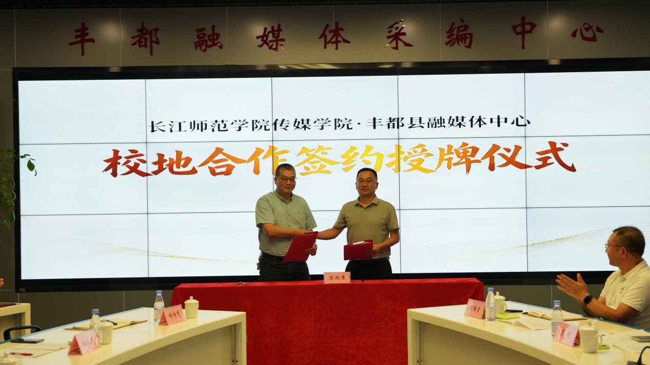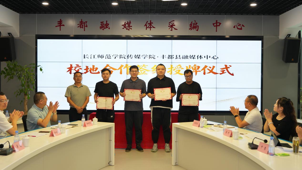 为进一步夯实合作基础,在与会人员的共同见证下,双方代表正式签署了校地合作协议。向丰都县融媒体中心进行了“实习就业基地”授牌。