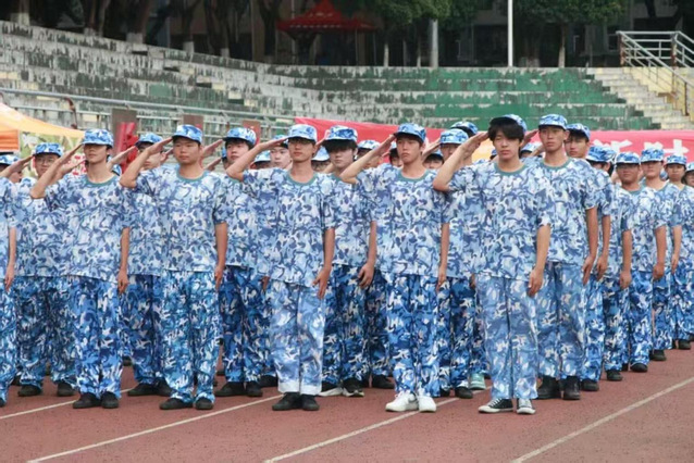 时值初秋,行健体育场上军容整肃、士气高昂。新生们队列整齐、口号铿锵,展现出良好的精神面貌。院领导细致观摩各连队训练情况,关切询问训练进展及学生身体适应状况。